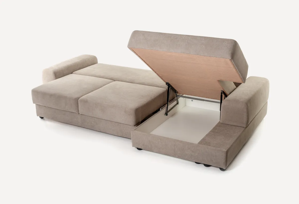 Самый ходовой модуль. У него уже есть механизм трансформации — пантограф. Это значит, что спальное место выдвигается легко, без лишних усилий. Внутри — ящик для белья. Ставится в центр композиции.