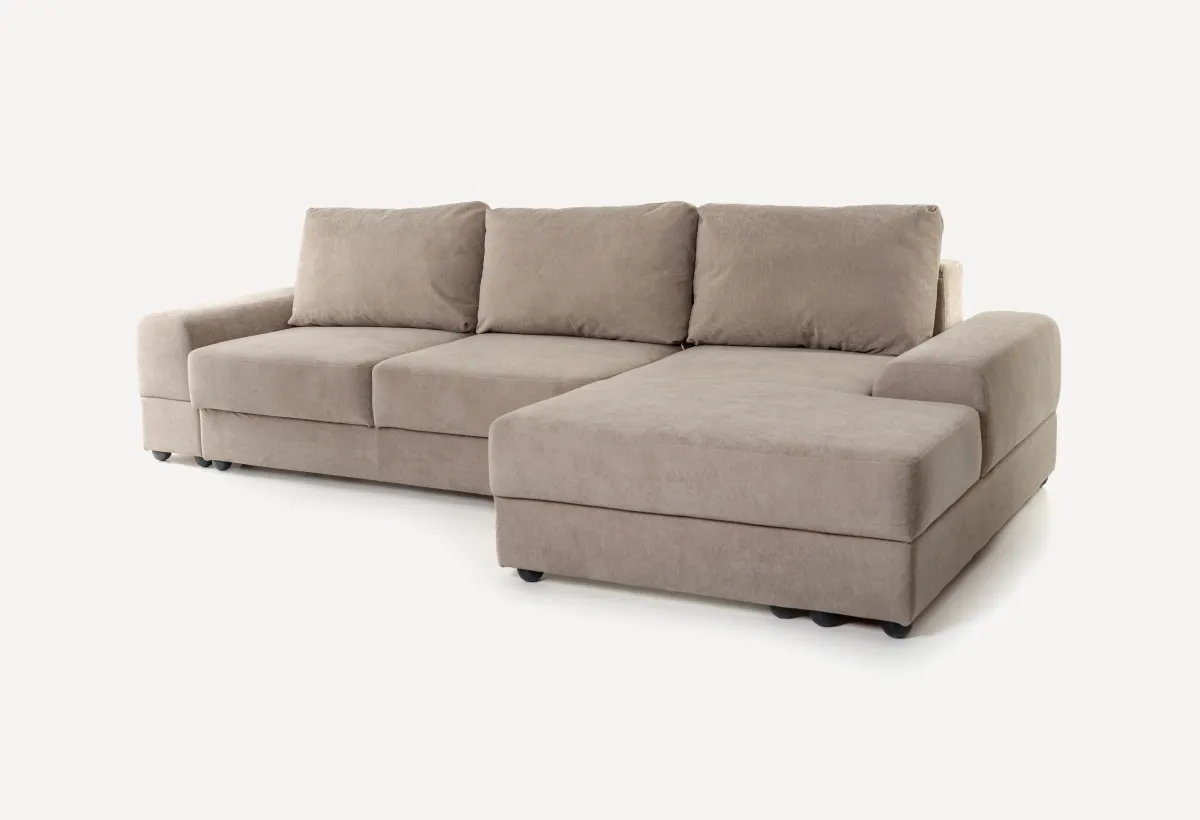 Диван Андрэа — это модульная система, которую вы собираете под себя. Хотите компактный прямой диван? Пожалуйста. Нужна большая угловая конструкция с местом для хранения? Тоже без проблем. Внешне — строгий минимализм. Никаких завитушек и лишнего декора, только прямые линии и простая геометрия. Благодаря этому он одинаково хорошо смотрится в современной гостиной, квартире-студии или даже спальне. Добавьте сюда детали из скандинавского стиля и лофта — получится мебель, которая не будет спорить с интерьером, а станет его аккуратной частью. Внутри — добротный каркас из ДСП и фанеры, пружинный блок «змейка» и многослойный поролон (жесткий, плотный, сверху — лотекс и холкон). То есть диван рассчитан на ежедневную нагрузку. Производитель заявляет до 110 кг на одно посадочное место и 140 кг на спальное. В общем, сделано на совесть. Соединяются модули между собой обычными болтами — ничего не будет разъезжаться.